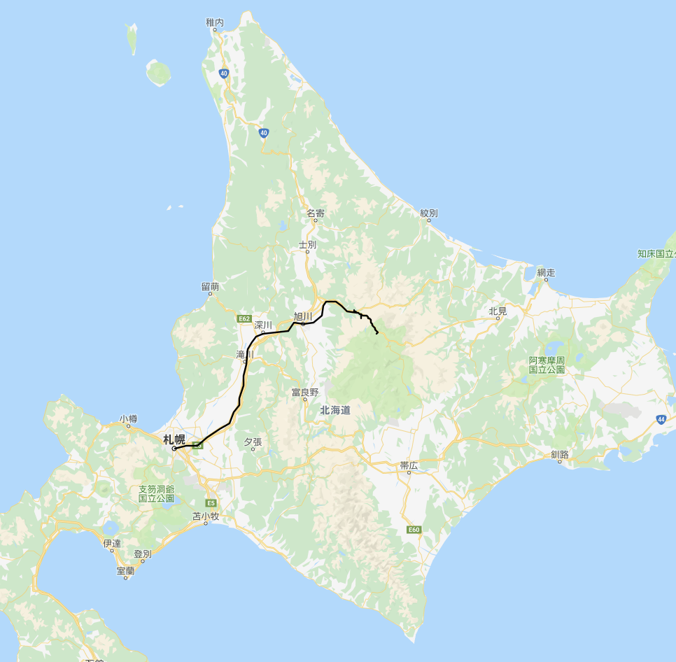 札幌 7:21 〜(JR函館本線・石北本線)〜 9:42 上川 〜(タクシー)〜10:00 旭ヶ丘 13:00 〜(タクシー)〜 13:30 上川 13:35 〜(道北バス)〜 14:05 層雲峡 15:40 〜(道北バス)〜 17:30 旭川 20:32 〜 (JR函館本線)〜 21:55 札幌