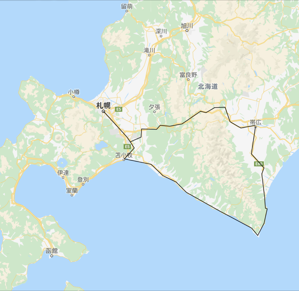 札幌 06:36〜 (JR千歳線)〜07:25 苫小牧 08:00〜(JR日高本線)〜11:19 様 似 11:35〜(JR バス)〜12:29 襟裳岬 14:54〜(JRバス)〜15:50 広尾 16:04〜(道南バス)〜18:45 帯広 20:33〜(JR石勝本線・千歳線)〜23:10 札幌
