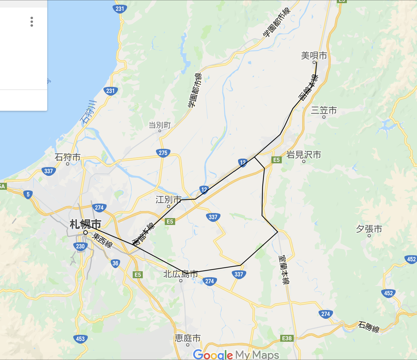 札幌 11:10〜(中央バス・高速)〜12:12 栗山 14:34 〜(JR室蘭本線)〜14:57 岩見沢 15:27 〜(JR函館本線)〜 15:43 美唄 18:45 〜(函館本線)19:20 札幌