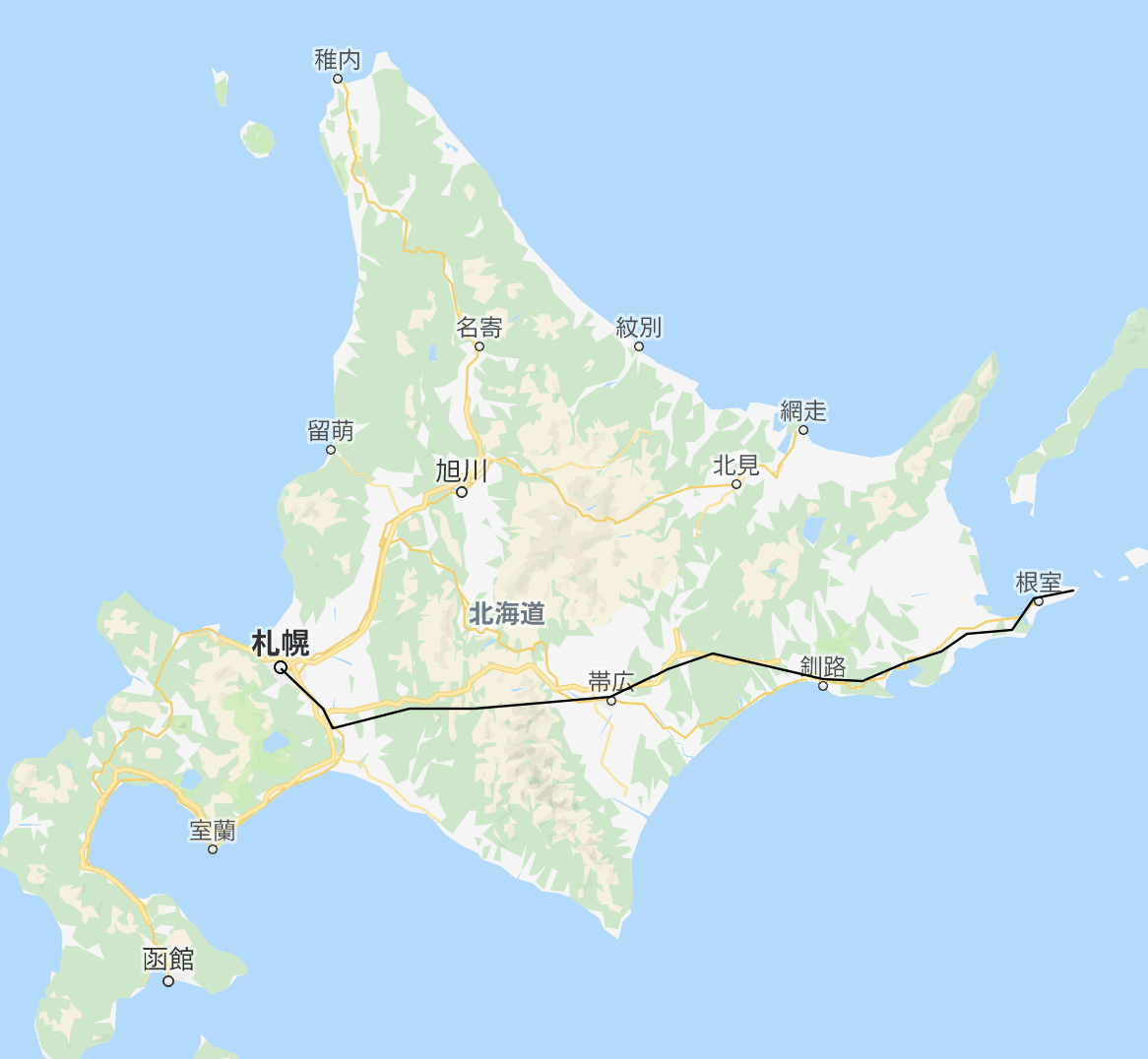 札幌 06:57 〜(JR千歳線・石勝線・根室本線)〜 10:59 釧路 11:12〜(JR花咲線)13:22 根室 13:45〜(根室交通バス)〜14:29 納沙布岬 15:10 〜(根室交通バス)15:54 根室 16:11 〜(JR花咲線)〜18:51 釧路 19:00 〜(JR根室本線・石勝線・千歳線)〜 22:58 札幌