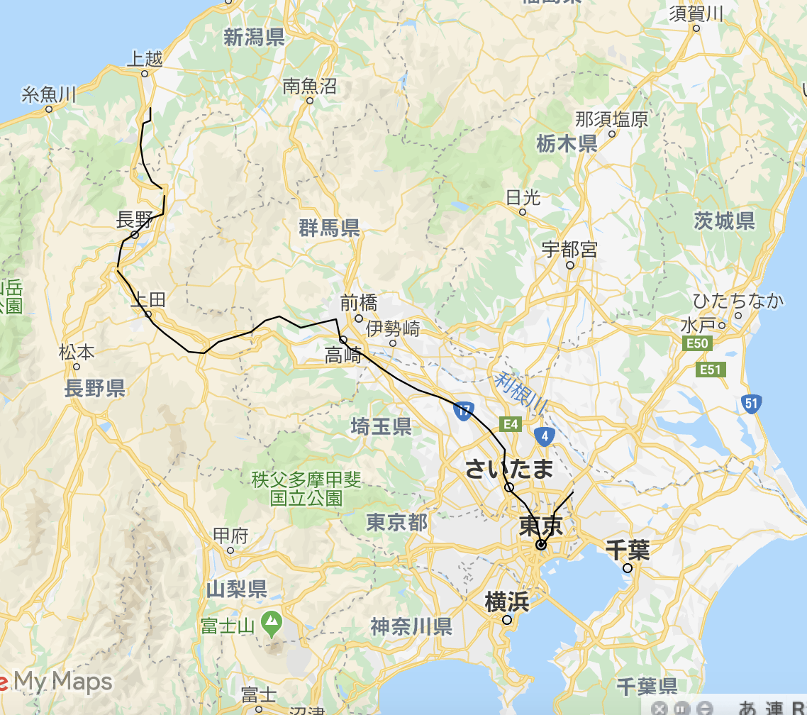 上田 8:35 〜(しなの鉄道)〜 9:17 長野 9:22 〜(しなの鉄道)10:17 妙高高原 11:39 〜(しなの鉄道)〜 12:14 豊野 12:48 〜(しなの鉄道)〜 13:03 長野 14:36 〜(しなの鉄道)〜 15:20 上田 19:20 〜(北陸新幹線)〜 20:46 上野 21:10 〜(常磐線)〜 21:30 松戸