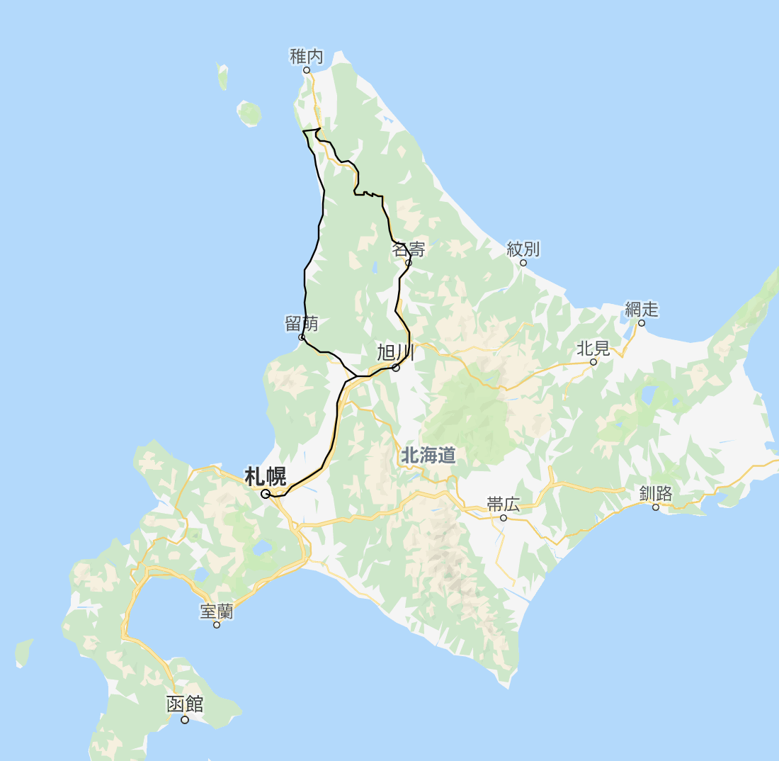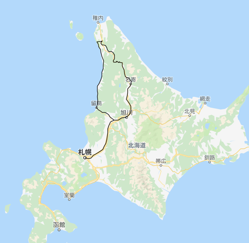 札幌 6:51 〜(JR函館本線)〜 7 :56 深川 8:05 〜(JR留萌線)〜9:00 留萌 9:10 〜(沿岸バス)〜 12:42 豊富温泉 13:42 〜(沿岸バス)〜 13:56 豊富 14:26 〜(JR宗谷本線)〜 15:47 音威子府 17:20 〜(JR宗谷本線)〜 18:55 士別 19:52 〜 (JR宗谷本線・函館本線)〜 21:55 札幌